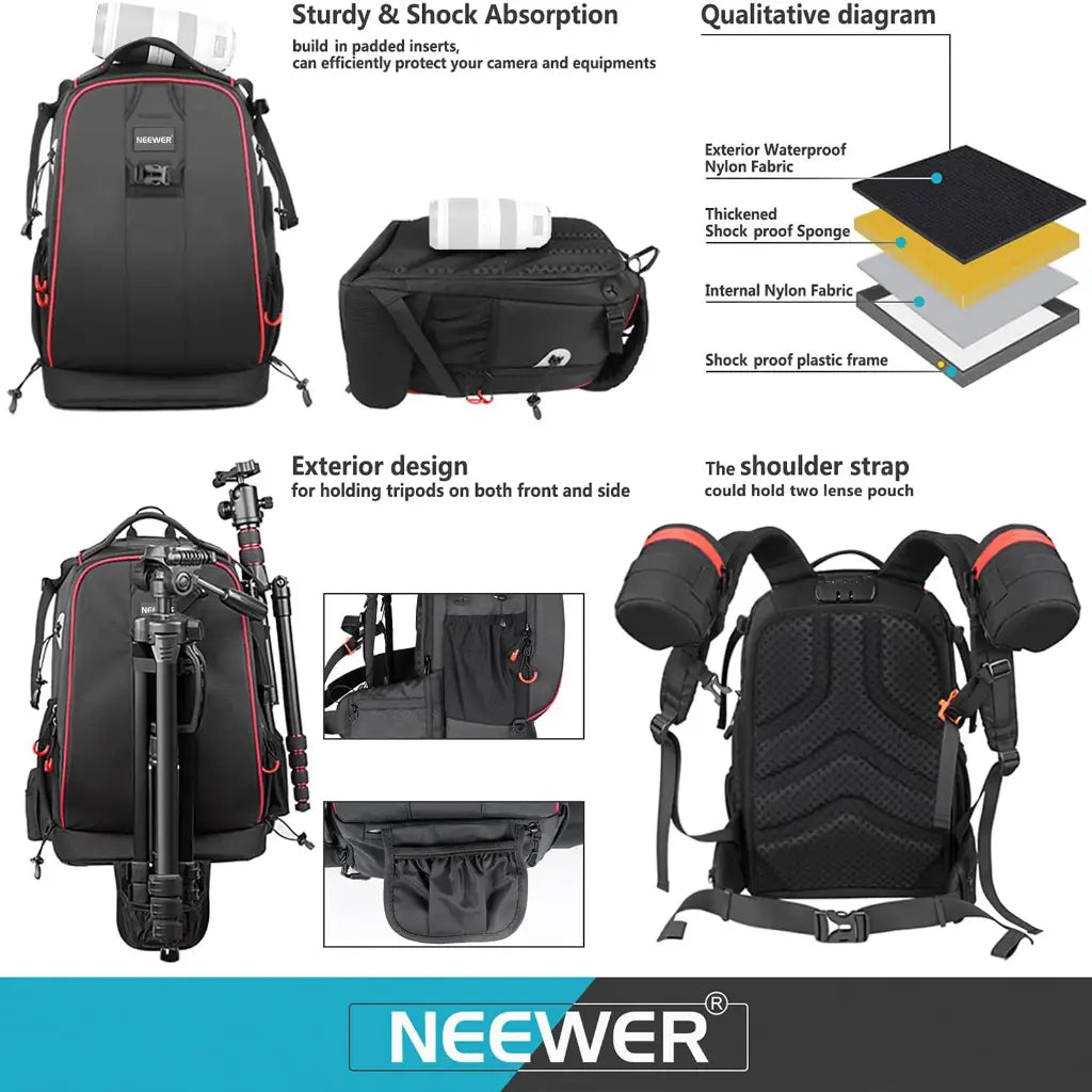 Porque combina seguridad, resistencia y versatilidad en una sola mochila. La Neewer 30L está diseñada para proteger tus equipos en cualquier entorno gracias a su fabricación impermeable, divisores ajustables y candado antirrobo. Su capacidad permite llevar tanto cámaras como drones y accesorios, convirtiéndola en una opción confiable para fotógrafos, viajeros y creadores de contenido.